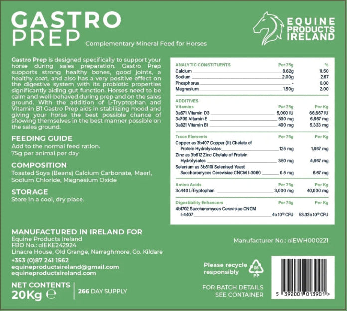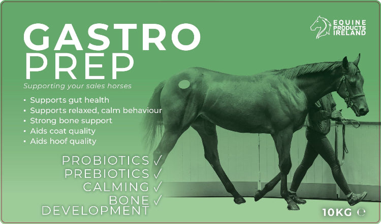 Gastro Prep supports strong healthy bones, good joints, a healthy coat, and also has a very positive effect on the digestive system with its probiotic properties significantly aiding gut function. Horses need to be calm and well-behaved during prep and on the sales ground. With the addition of L-Tryptophan and Vitamin B1 Gastro Prep aids in stabilizing mood and giving your horse the best possible chance of showing themselves in the best manner possible on the sales ground.
