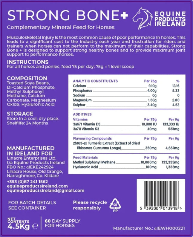 Strong Bone + is a revolutionary new supplement that is multifunctional. It is designed to support strong healthy bones and to significantly aid joint function in performance. Therefore, providing significant benefits to horse owners, trainers and riders worldwide.